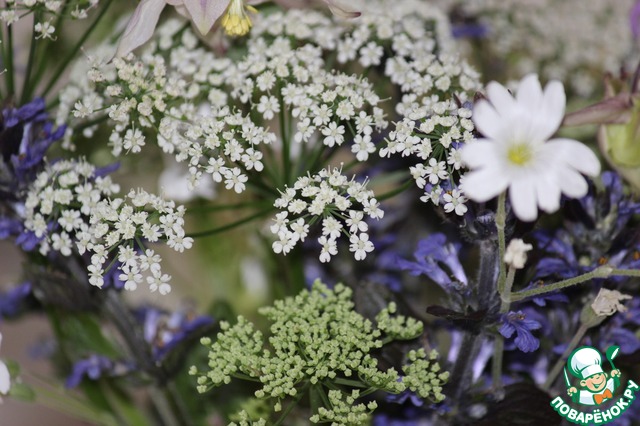 В букете - живучка, сныть, левкои, аквилегия (водосбор), ясколка, звездчатка.