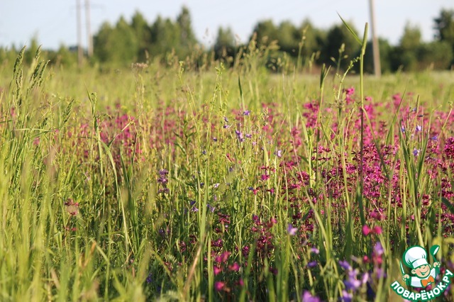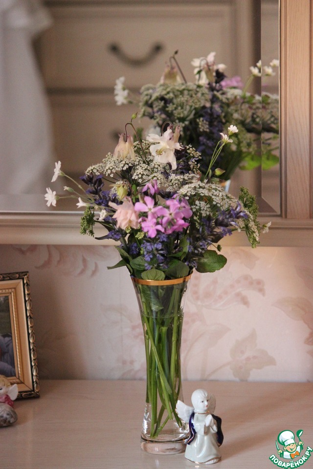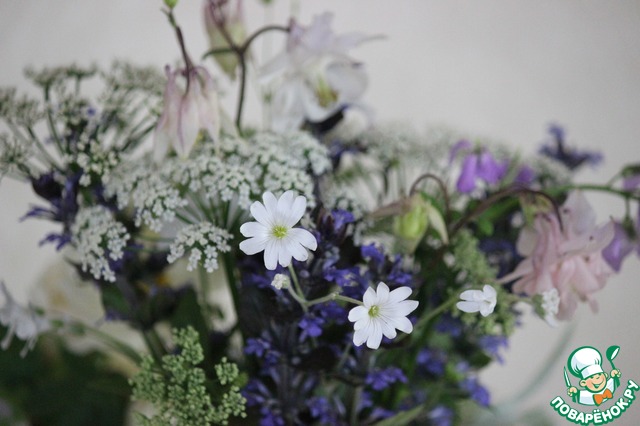 В букете - живучка, сныть, левкои, аквилегия (водосбор), ясколка, звездчатка.