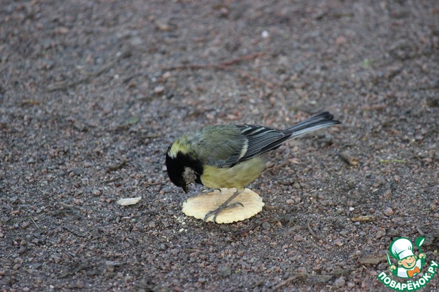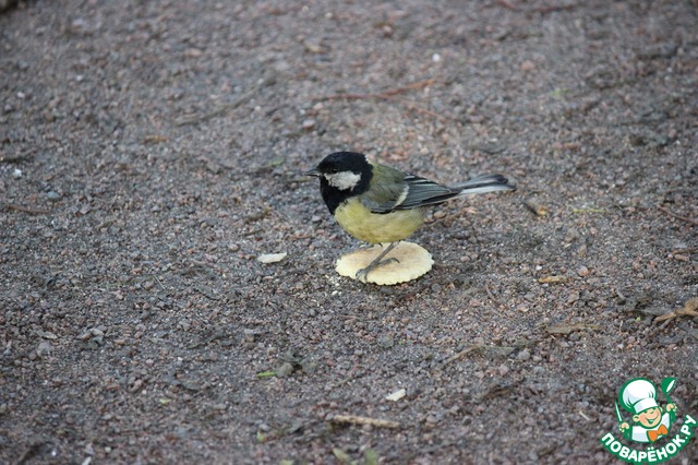 Синичка нашла себе обед или ужин)) удачно кто-то печеньку потерял!