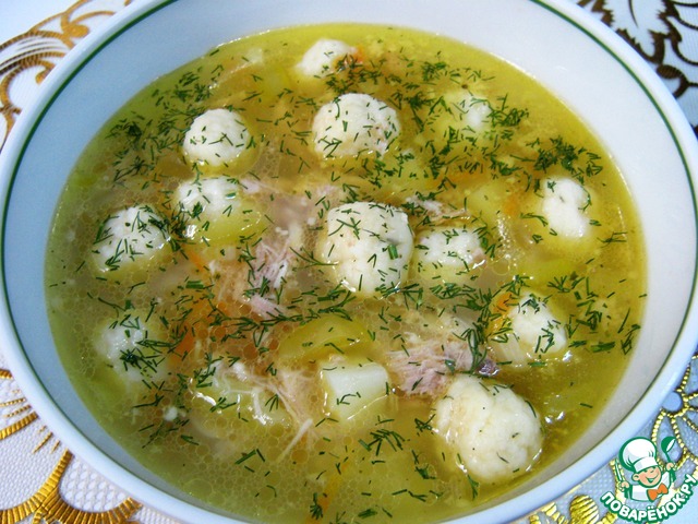 Ароматный, красивый, сытный супчик получился! Я отварила окорочок, сын помогал - его измельчил и скатал сырные шарики)). Перед подачей посыпала укропом. Очень вкусно!!!