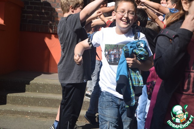 Дети одели заранее заказанные футболки с фото своего класса - только наш класс, а 4-В был в своей повседневной одежде.