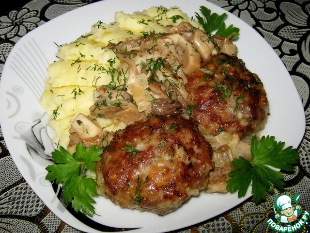 Биточки замечательные получились! Нежные, сочные, ароматные! Соус шелковистый сливочный! Грибы - вешенки, прекрасно дополнили блюдо. На гарнир у меня картофельное пюре. Так вкусно мы пообедали!