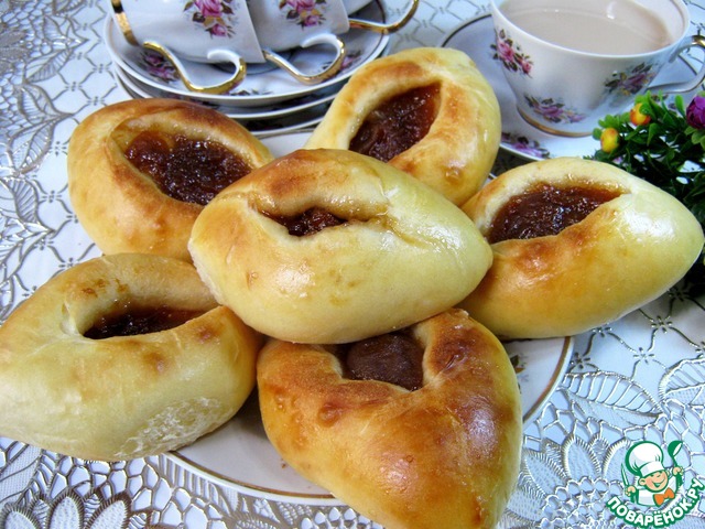Пирожки получились чудесные! Воздушные, пышные, мягенькие, нежные! Очень вкусно! У меня абрикосовое варенье.