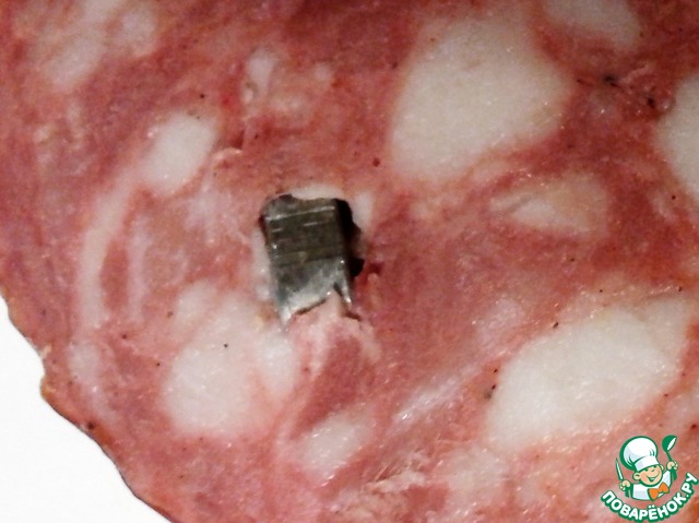 Вот опять получила очередное доказательство того, что нужно готовить самой. Муж любит колбасу, поэтому я ее и покупаю. И смотрите, что в нее добавили. Я конечно знаю, что железо полезно для организма, но не такими же кусками