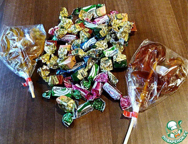 Россыпь очень вкусных конфеток и два огроооооомных петушка