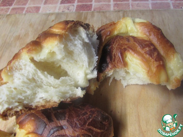 Ох и намучилась я с этим пирогом. Не мой день просто был. Тесто замешивала в ХП, все отлично подошло, работать с ним было приятно. Но вот крем… Он старался вылезть из всех щелей. В результате половина крема осталась на столе. Да еще забыла поставить таймер на духовке, в результате булочки вот такие подрумяненные. Но… Какой же аром стоял на всю квартиру!!! Да и булочки получились вкусные, мягонькие. Ничем сверху не поливала и не смазывала, мне крема со стола хватило!