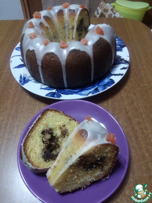 Это кекс на мандариновом соке от замечательного поваренка Натальи (natapit). в нем вкуснейшая прослойка, в которую можно положить и чуть меньше орехов, чем указано в рецепте, все равно будет вкусно