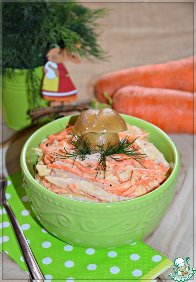 Уже и не помню, сколько раз я готовила этот салат... Сочный, яркий, очень вкусный. При этом прост в приготовлении, доступен и готовится за десять минут. Салат на все случаи жизни:будь то обычный семейный ужин или праздничное застолье. ХорОш в любом качестве. (готовлю обычно это салат с белыми грибами)