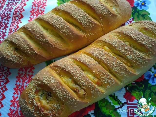 Так вот, сегодня, на свой юбилей, она заказала этот хлебушек)И я с радостью его спекла для нее. Начинка-сыр, базилик, болгарский перец, бекон, оливки, специи.