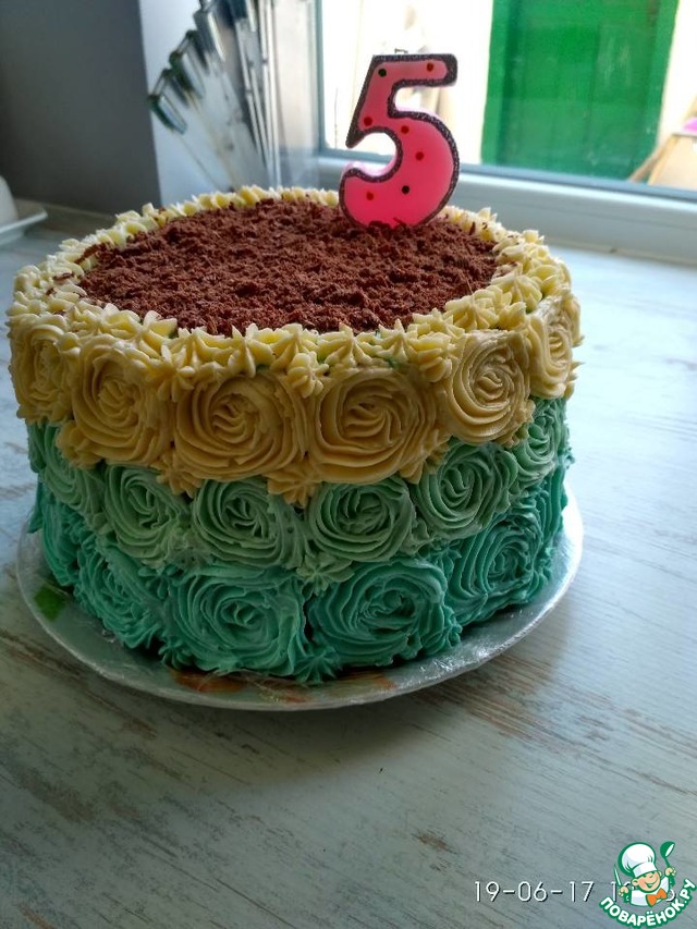 Торт я пекла ко Дню Рождения племяшке, пропитывала вишнёвым сиропом и в крем добавила свежую вишню. Крем использовала сметанный. Очень понравился, разрез очень не обычный (у меня его нет, т. к торт ехал в гости, можно увидеть разрез у автора на страничке)!! Буду повторять)