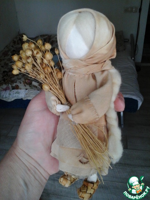По итогам выходных родилась вот такая куколка - я нашла на поле пару пучков высохшего и чудом не сгнившего льна - раньше у нас все поля были голубее неба - лен так красиво цветет! А потом сеять его не стали, жаль. Я посею немного льняного семени в следующем году - как-то скучно без него. Тканюшки на платье покрасила луковой шелухой, косички сделала из шерсти мериноса. Такие куколки раньше назывались ладонными - умещались в ладонь хранящего их.