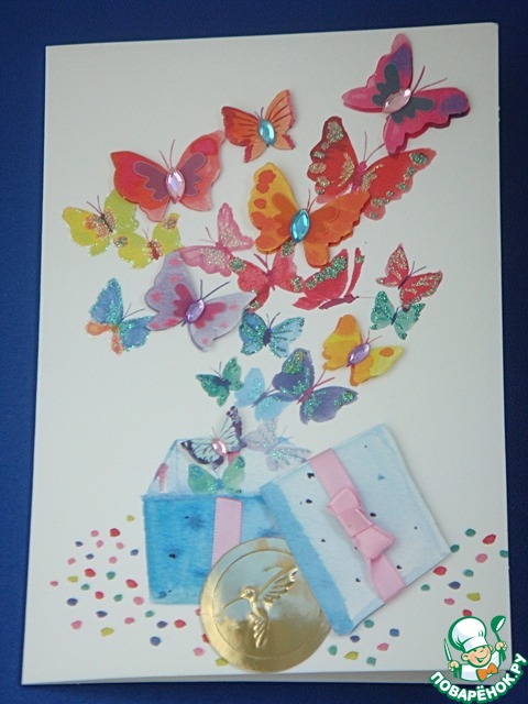 Я просто в восторге, который не передать словами! Жаль, что фото не отражает всю красоту открытки ручной работы. Яркие, объемные, мои любимые бабочки с потрясающими камешками, которые я просто обожаю!