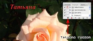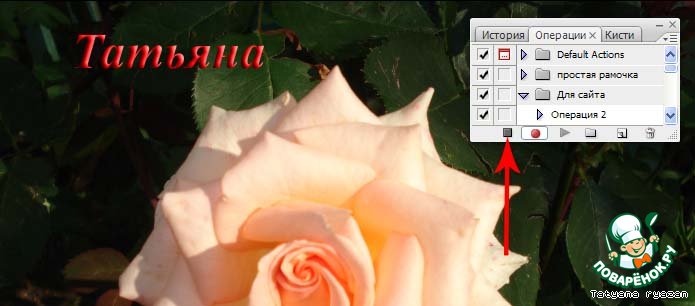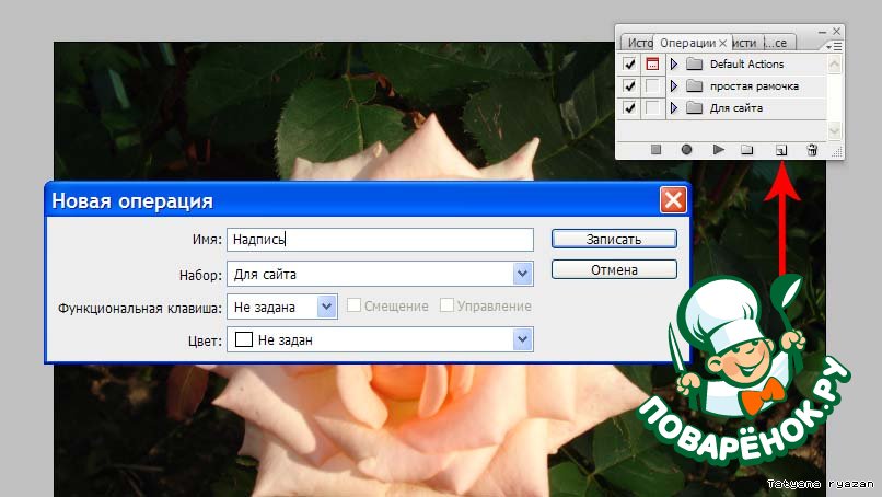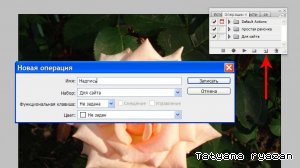 После того как ваша фотография загрузится, необходимо открыть окошко Операции, для этого выполните команду Окно/Операции или нажмите Alt+F9. Далее на появившемся окошке внизу найдите кнопку Создает новую операцию. На рис. 2 на эту кнопку указывает красная стрелка. В результате появится окно Новая операция,в поле Имя напишите подходящее имя для этой операции, например, как у меня Надпись. Затем нажмите кнопку Записать.