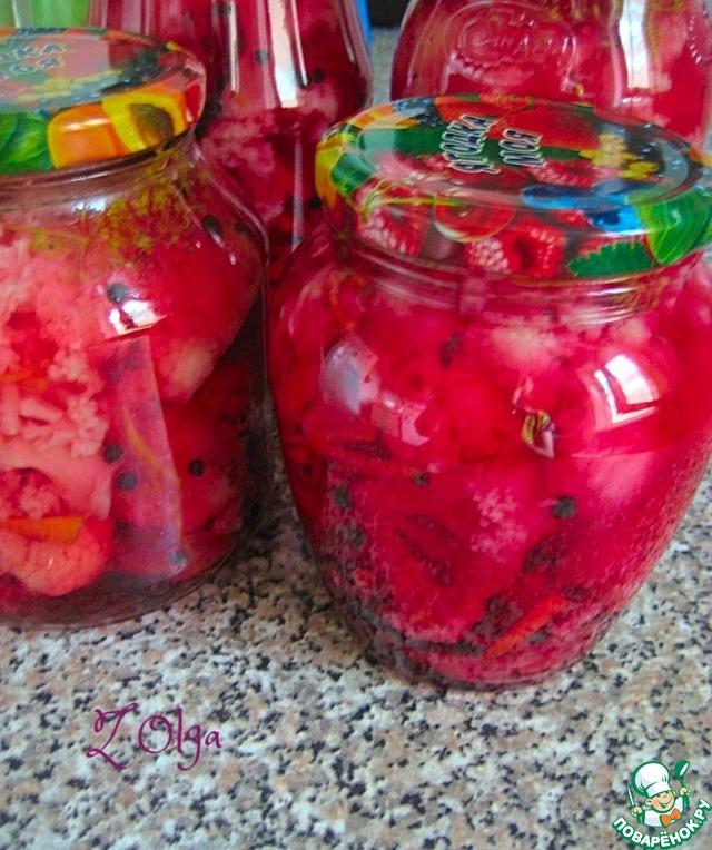 Цветная капуста в розовом маринаде https://www.povarenok.ru/recipes/show/142873/ по рецепту Людочки yugai ludmila65! Увидела рецепт и сразу поняла, что я это обязательно сделаю! Сразу могу сказать, что по вкусу мне очень понравилось, т. к. получилась одна не полная банка, я ее оставила в холодильнике и попробовала уже на следующий день! Вкусный маринад, красивая капусточка!