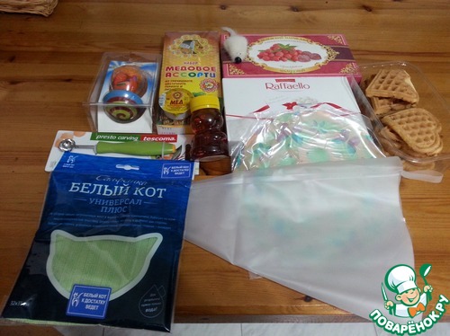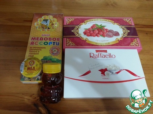 Это сладкая часть подарка. Разные виды меда в красивой упаковке. Мишка-баночка тоже со вкусным медом. Для моего мужа- любителя мармелада, белевский мармелад. Он сам него и слопал. И очень вкусные Рафаэлло.