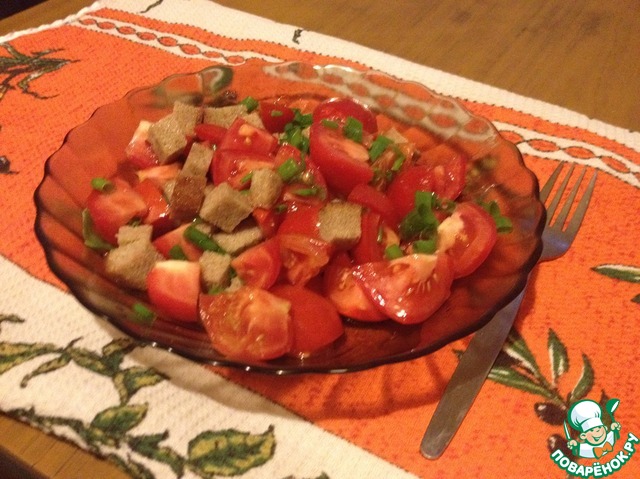 Ну если речь зашла о помидорах, то следующим номером будет салат из ржаного хлеба с помидорами от Ольги - Демоника https://www.povarenok.ru/recipes/show/58808/. Вспоминается август, светлая комната на набережной Мартынова, круглый стол посередине, за столом сидит бабушка и ест этот салат. Я, будущая первоклассница, отказываюсь есть второе и прошу попробовать бабушкин салат. Так мы и съели пополам салат и моё второе. Оля, спасибо за приятные детские воспоминания. Я готовила этот салат наверно через день себе на обед. Сына попробовав тоже подсел. Единственное, я использовала зелёный лук.
