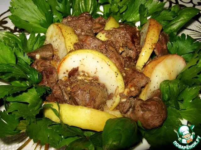 Салат нам понравился! Мы любим сочетание яблок и печени. Яблочки я слегка обжарила, зелень использовала, которая была в хозяйстве. Печень нежная. Заправка, чесночок, молотый черный перчик обогатили вкус салата. Ели с удовольствием!