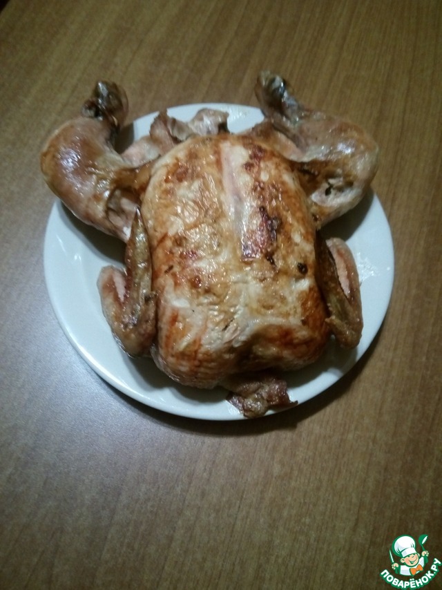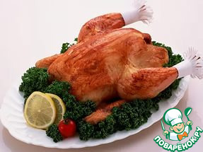 Курица запекается целиком, поэтому и на праздничном столе будет очень к месту, украсит его, без сомнения