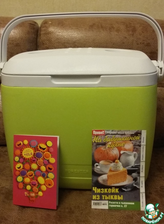 Ну а подарок (я знаю, что это приз, но пусть будет подарок!) от Поварёнка с Киккоманом просто поражает своими размерами. Такой вместительный и удобный в использовании холодильник! Обязательно будет кататься со мной в машине на природу и в дальние поездки. Большое спасибо!