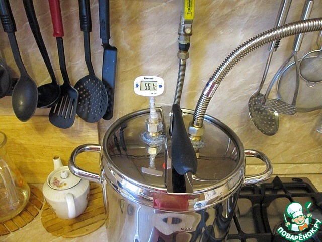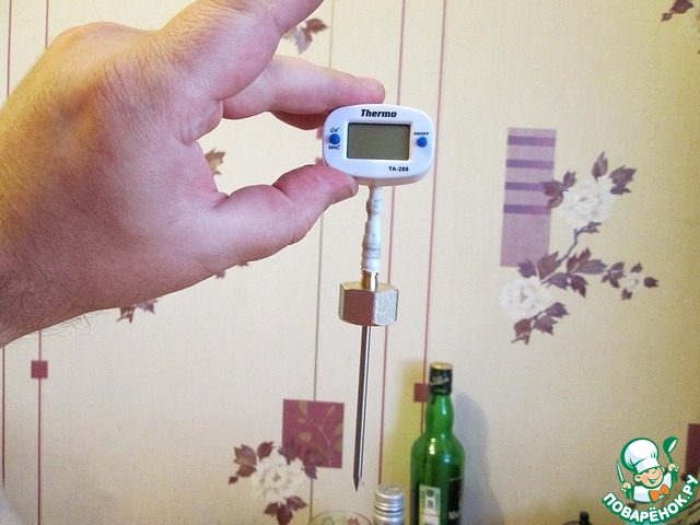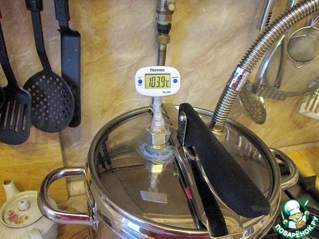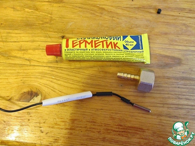 Берем два переходника с ½ на шланг, как он там называется по научному, и устанавливаем в них термометры. Для скороварки я использовал термометр для замера температуры мяса, он с длинным штырем. Для контроля температуры пара, на входе холодильника, я использовал простой электронный термометр. Как собирал видно из фотографий, уплотнял силиконовым герметиком и синей изолентой. Сверху осаживал термоусаткой, все просто очень. Вот что понадобится.