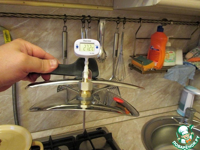 Делаем отверстия а крышке скороварки. Две штуки. Одно для термометра, другое для выхода паровой фракции.