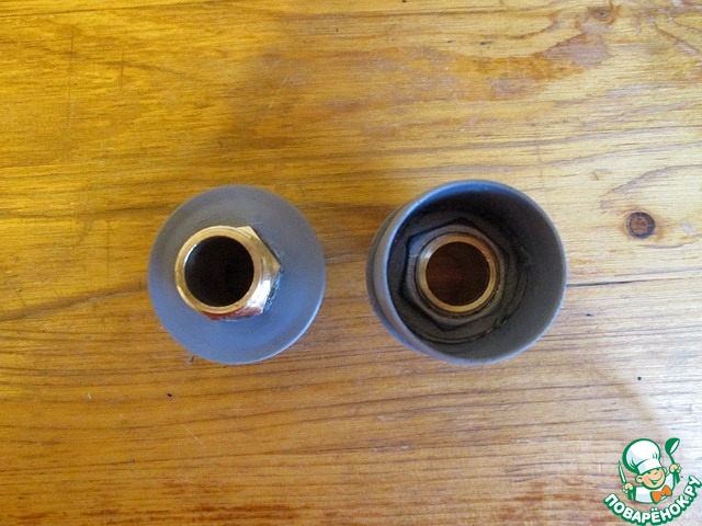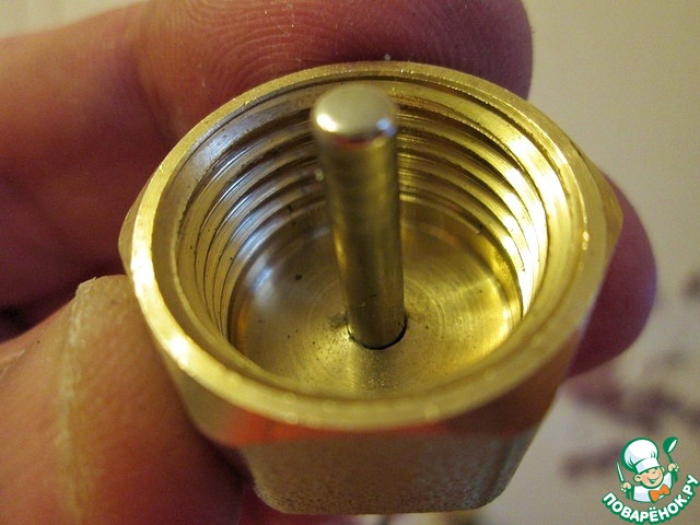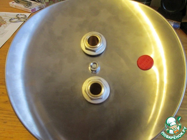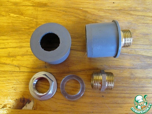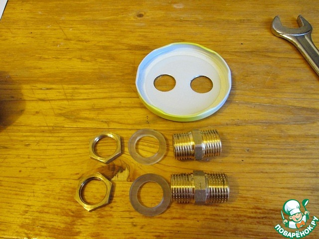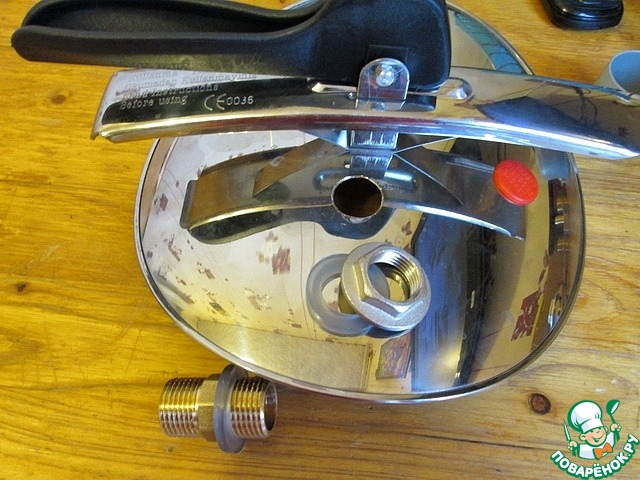 Так, отверстия готовы и можно приступить к завинчиванию ниппелей везде куда нужно, а нужно нам завинтить в крышку от скороварки два ниппеля, один для отвода пара другой для термометра, завинтить в заглушки и к крышку прикубника. Не забываем в процессе использовать только силиконовые прокладки и промазывать их силиконовым герметиком. Герметик берем «пищевой», который для аквариумов. Вот собственно весь процесс.