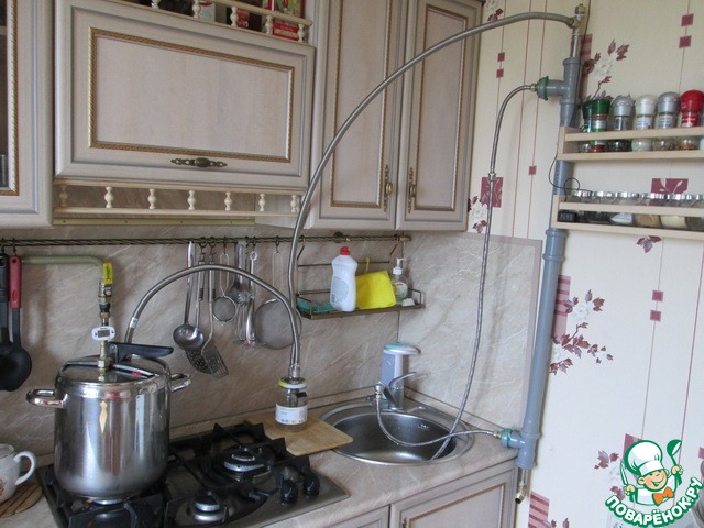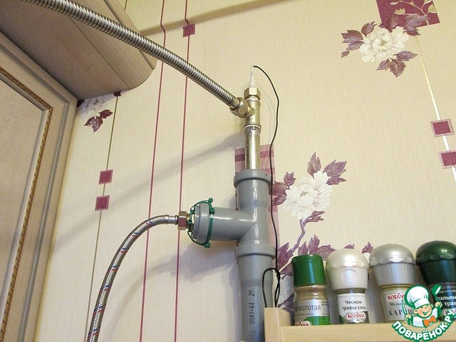 Далее крепим жестко холодильник к стене, подключаем к крану гибкую потводку, на всяк случай страхуемся стяжками от срыва. Соединяем скороварку с холодильником через прикубник (мокропарник). Соединяем с помощью нержавеющей газовой подводки. Не забываем что прокладки должны быть только силиконовые или паранитовые, обычные резиновые дадут запах в дистилляте.