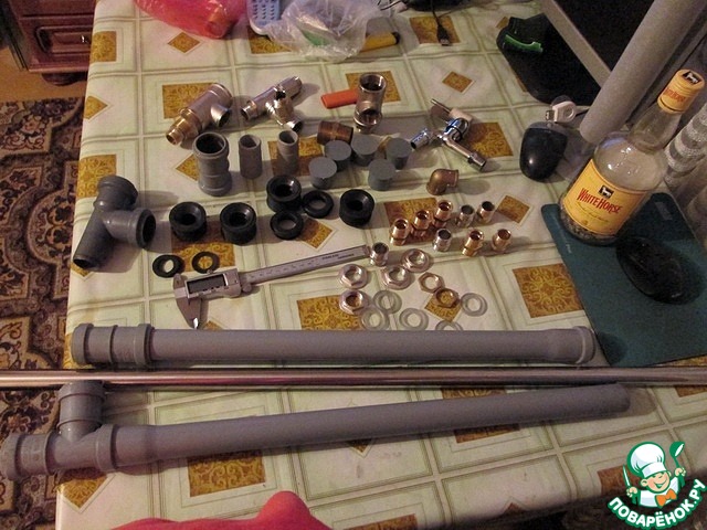 Отобрал для работы вот такой набор компонентов, два тройника, два куска трубы, одну муфту, две заглушки, и два уплотнителя, их используют для подсоединения шланга стиральной машинки. На краник внимание не обращайте, он дикий, по всей квартире кочует, как кот