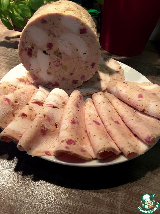 А ещё мне понравилось, что мало желе (думаю, что из-за крахмала) и структура такая, что легко нарезается ломтерезкой достаточно тонко. Мы любим, чтобы колбаска была порезана тоненько.