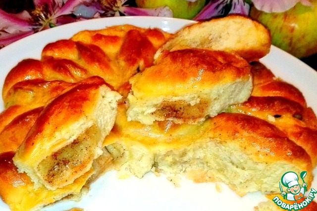 яблок добавила корицу. Смазала пирог желтком + масло + ванилин.