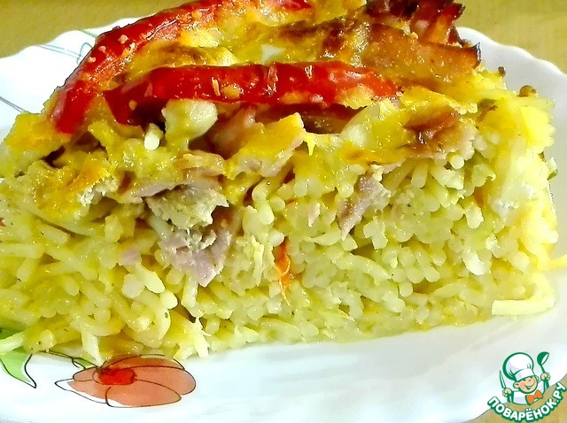 Вкусная запеканка! Спагетти, мясо курицы, ветчина, лук