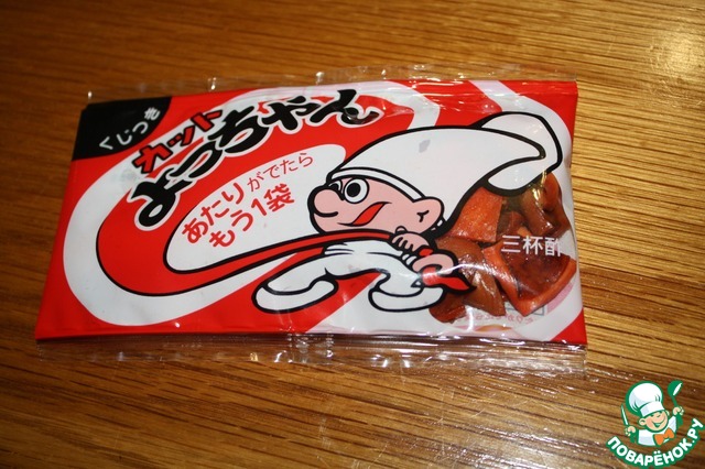 Такой живописный пакетик, я думаю что это кальмар, так как очень сложно понять что это, все написано иероглифами