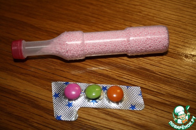 Шоколадные конфетки в виде таблеток и какая то сахарная крупка в бутылочке