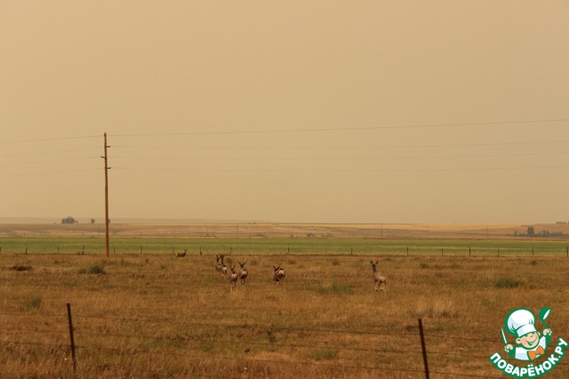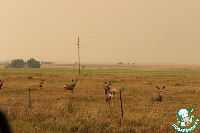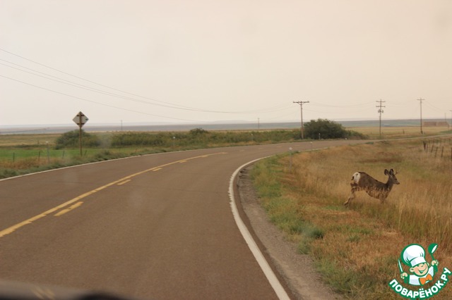 По дороге из Йеллоустоуна видели диких оленей. Семейство оленей перебегало дорогу...