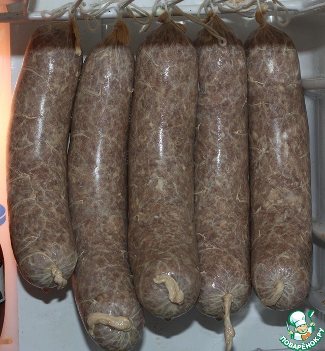 С калибром оболочки китайцы, как водится, обманули. Колбасы получились диаметром 45 мм, но это все равно лучше, чем 24 мм, которые у меня были до этого. Теперь они подвешены в холодильнике для усадки.