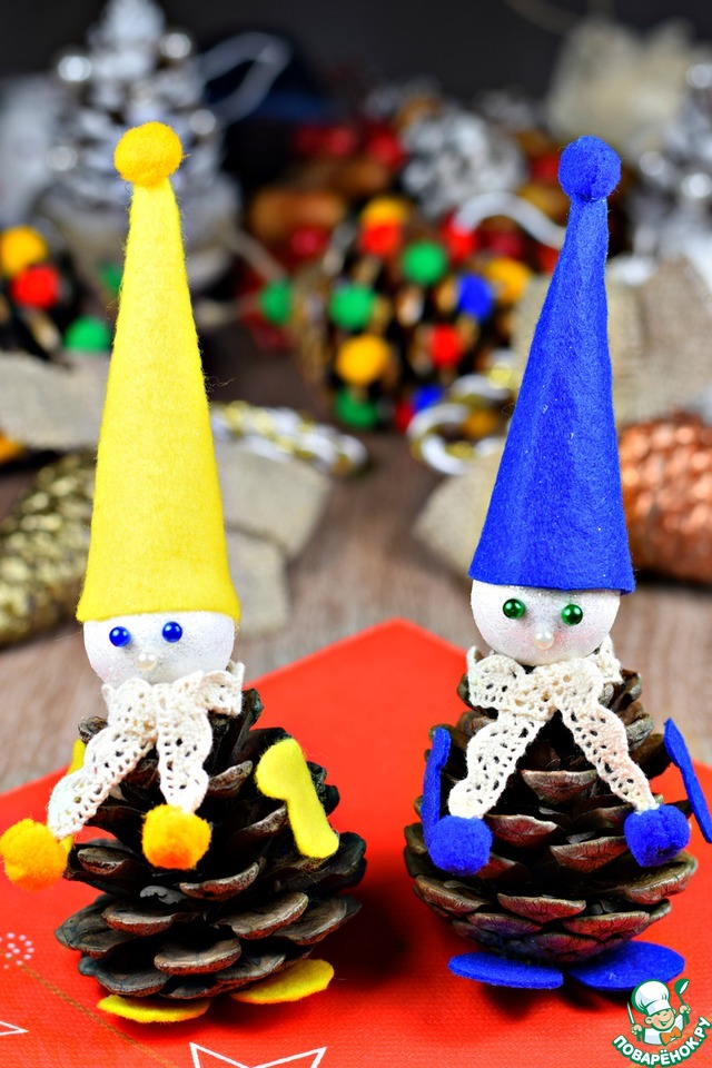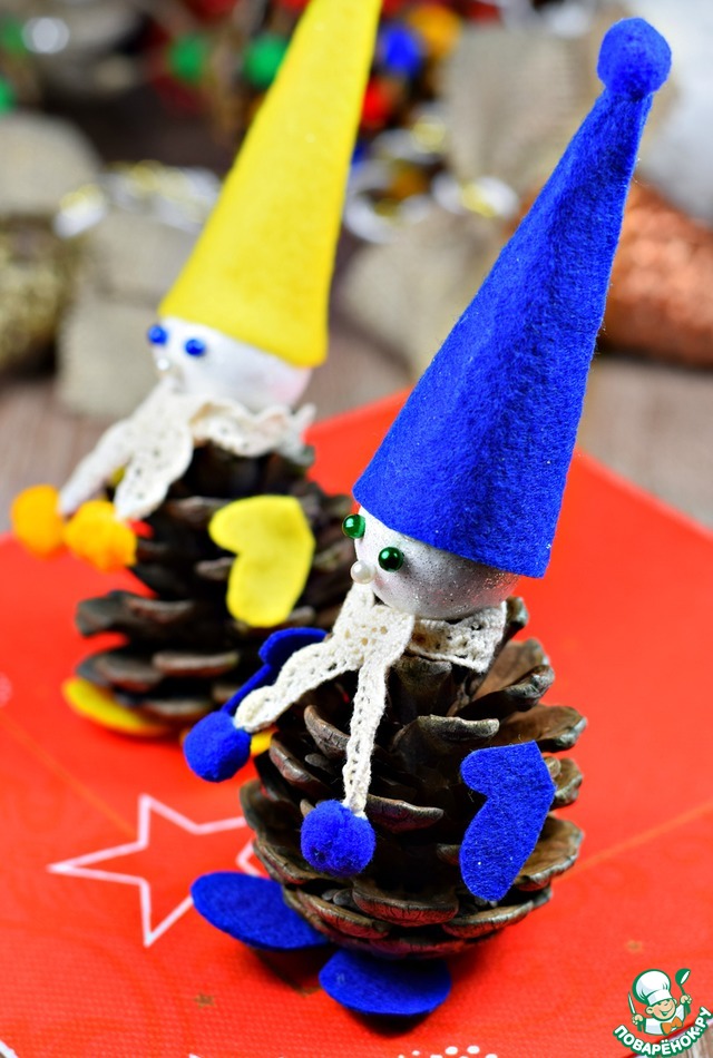 Вот такие симпатяги гномики из шишек. Можно поставить под елку, а можно повесить на нее.