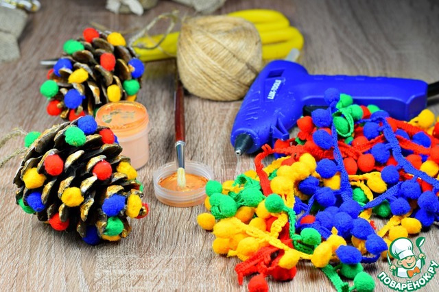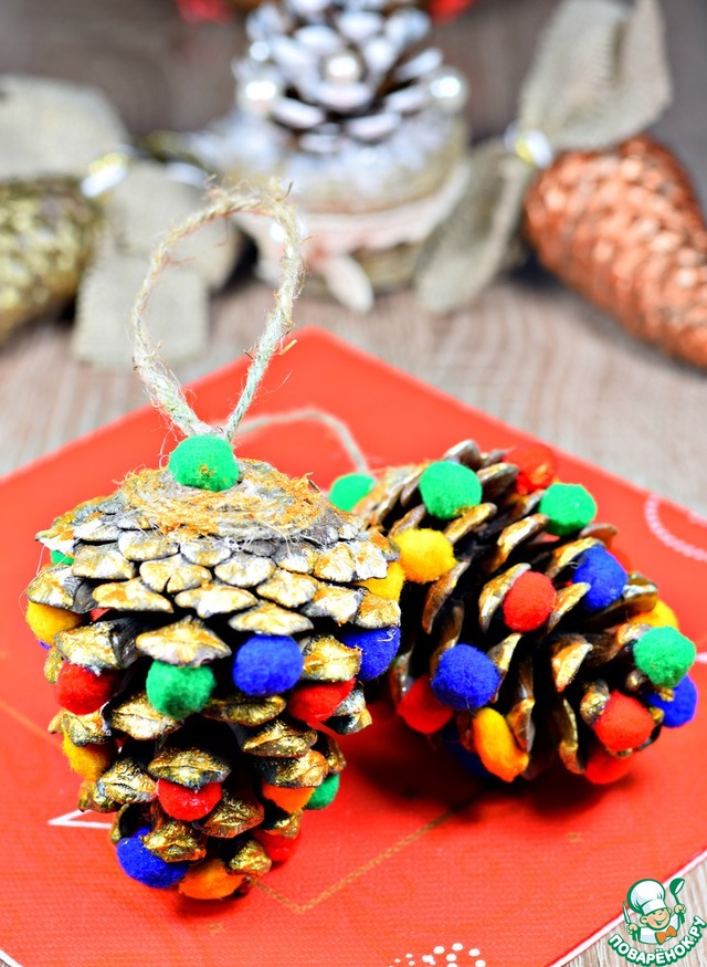 Крупные шишки покрасить золотой акриловой краской и приклеить произвольно на них цветные бубончики. А петельку сделать из не очень толстого шнура или джутового шпагата.