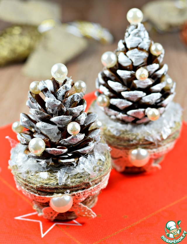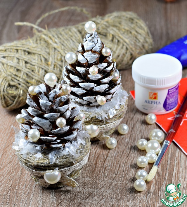 Тут нам понадобится небольшая рюмка, джутовый шпагат, бусины или жемчужинки, шишка и клей, конечно. Наверняка у вас найдется какая-нибудь ненужная стопка или рюмка. Так вот, можно плотно обмотать ее шпагатом, посадив шпагат на клей. Это будет горшок для елки. Шишку покрасить белой акриловой краской и "посадить" в горшок. Украсить бусинами или жемчужинками.