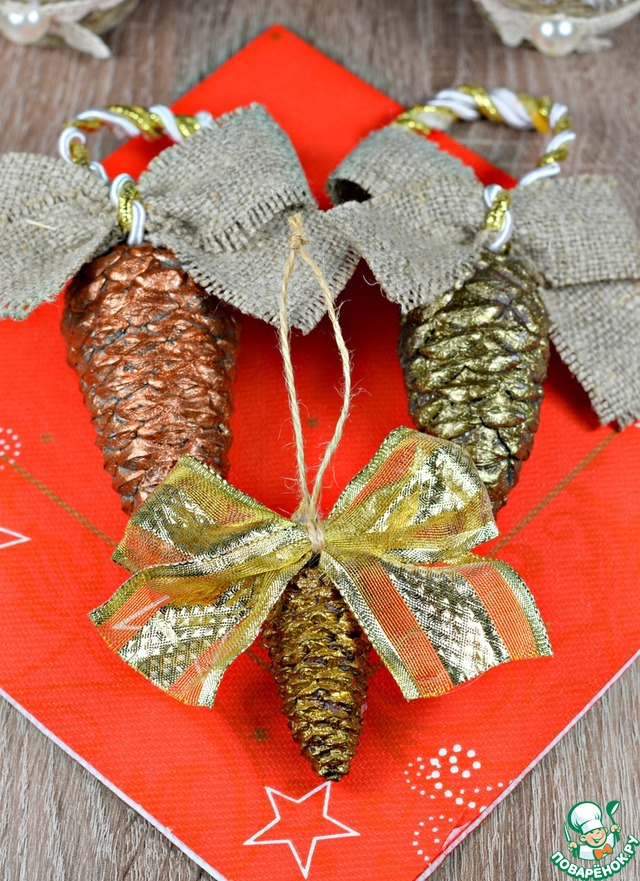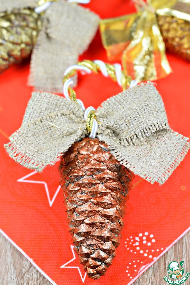 Тут совсем все просто! Покрасить шишку золотой/серебряной/бронзовой... краской, сделать бант из подходящего материала (у меня банты из рогожки и ленты) и приклеить бант на шишку. Все готово!