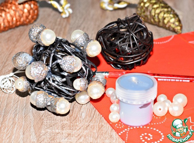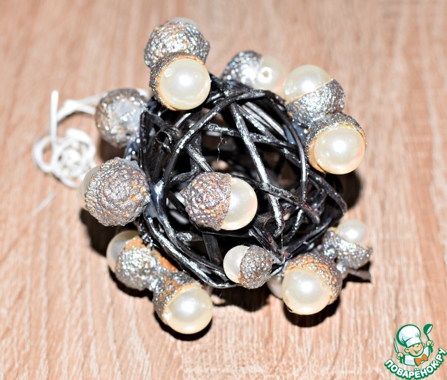 Шляпки от желудей покрасить серебряной краской и вклеить вместо самих желудей крупные жемчужины. Произвольно приклеить эту красоту на какой-нибудь шар. И оригинальная игрушка готова. Такой точно больше ни у кого нет!