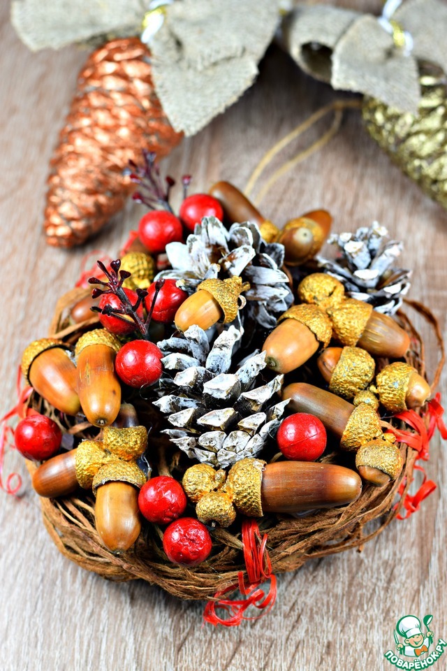 Осталось несколько некондиционных шишек и желудей. Получилось вот такое украшение - венок. (или гнездо
