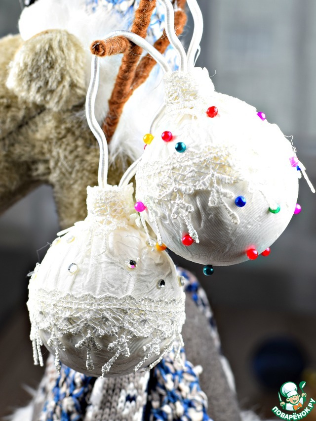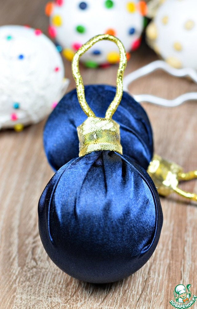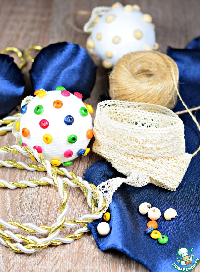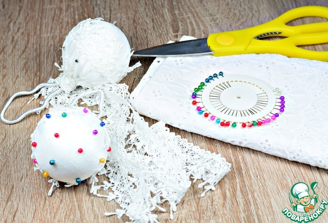 Пенопластовый шар плотно обтянуть тонкой тканью и декорировать его кружевом, бусинками или пайетками. Я еще проще поступила: воткнула цветные портновские булавки в шарик.