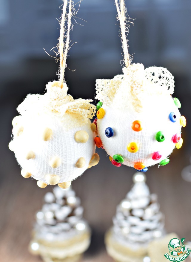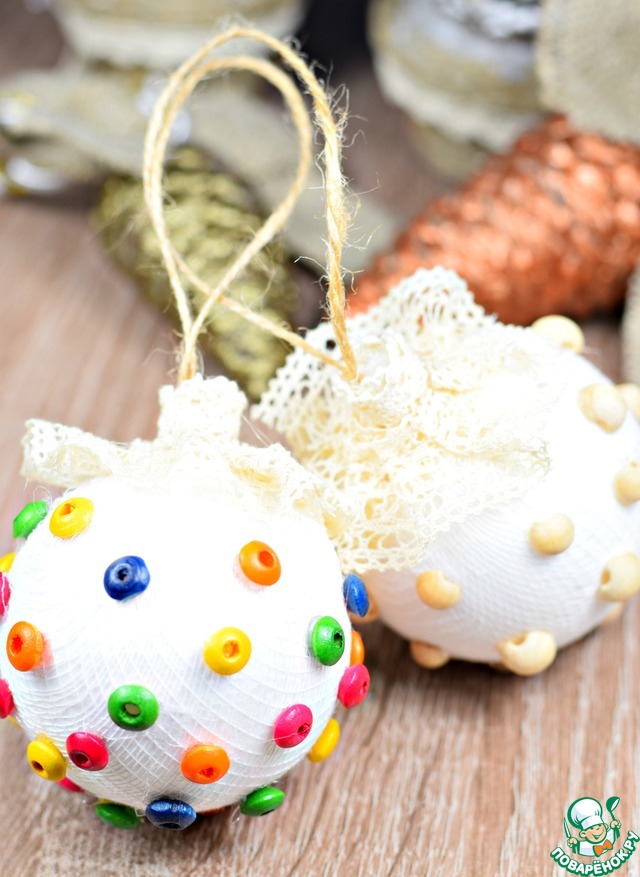 Здесь все то же самое. Я обтянула одни пенопластовые шары марлей, а другие - яркой синей тканью, сделала петельки из красивого шнура и джутового шпагата и декорировала шары деревянными бусинами и хлопковым кружевом.