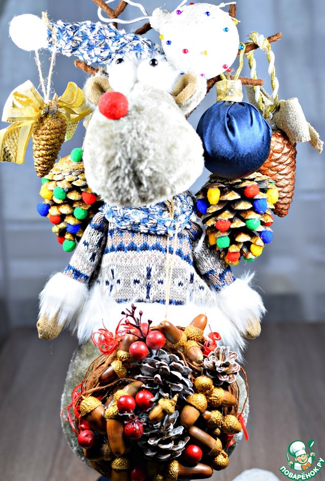 Конечно, эффектнее смотрелись бы все эти украшения на новогодней красавице, но... Ставим мы ее только 24 декабря, традиция. Поэтому демонстрирует мои поделки вот этот товарищ, лосяша. Неплохо справляется, парень.