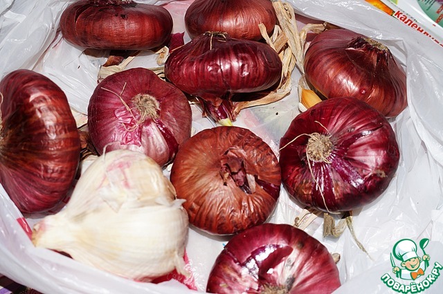 А вот лучок ялтинский! Люблю красный лук, такого сорта у нас тут нет. А от чеснока мы прямо обалдели -такой огромный!