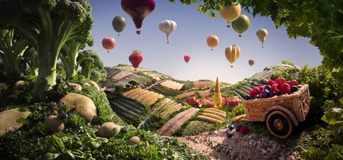 Только при детальном рассмотрении Вы понимаете, что это вовсе не рисунки, а настоящие фотографии настоящих овощей, фруктов, хлеба, сыра и других пищевых продуктов! Именно поэтому его food landscapes (продуктовые пейзажи) ещё называют foodscapes.