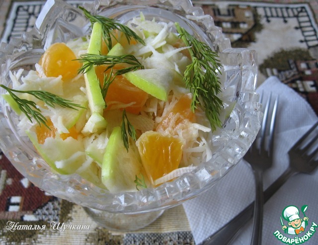 Свежий, витаминный, сочный и очень питательный. Готовила салат по рецепту. Только добавила чуть-чуть соли к капусте и пару раз слегка потёрла, чтобы быстрее выделился сок.