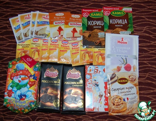Специи, сладости и новогодний подарок с конфетами с милым снеговичком! Муж уже раздербанил подарок, съел половину конфет и косит глаз на шоколадки!!!