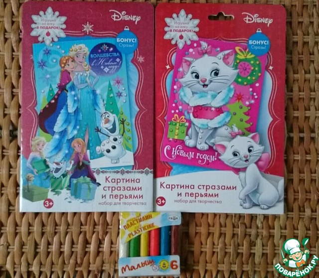 Еще подарки для малышки: картинки со стразами и перьями "Холодное сердце" и... забыла, как называется тот мульт с кошечкой, и пластилин - будет чем заняться в плохую погоду!!!