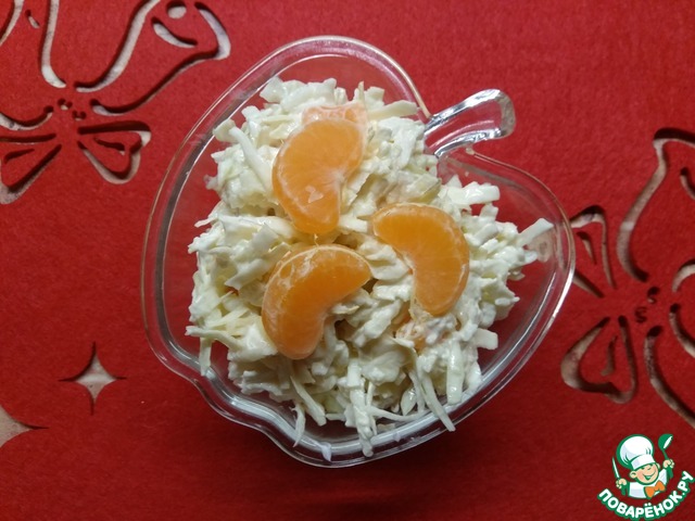 Приготовила салатик. Интересный вкус, сладковатый, при надкусывании мандаринки вкус становится более нежным. Интересно было попробовать. С картошкой и прочим гарниром, думаю, не пойдет, а вот просто отдельно можно побаловаться.